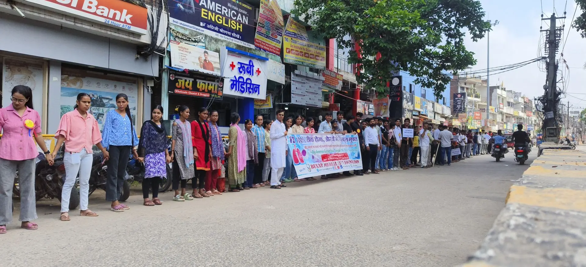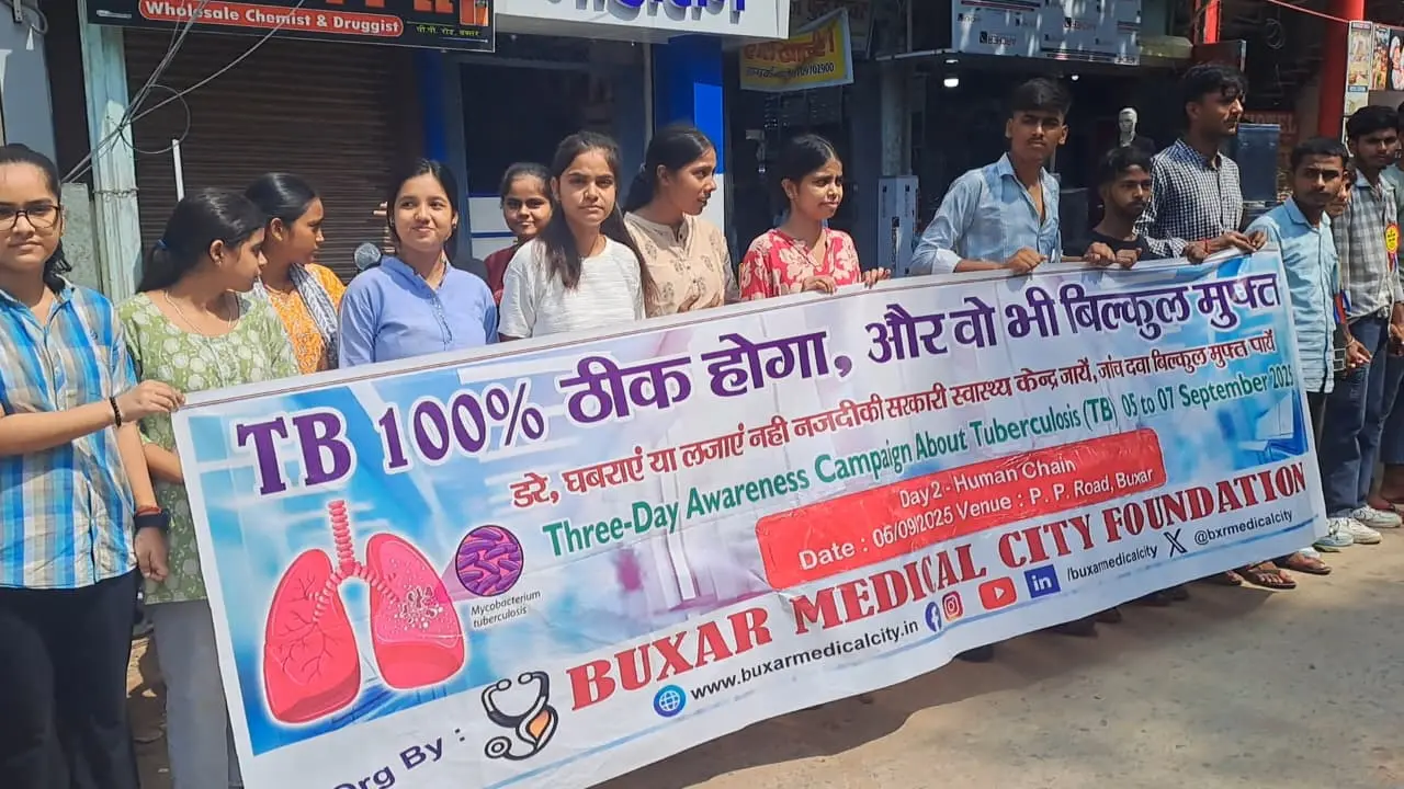 A human chain was successfully formed at P.P. Road, where hundreds of citizens, students, social workers, and representatives of voluntary organizations participated. Participants held placards with awareness messages and took a pledge for a “TB-Free Buxar.”